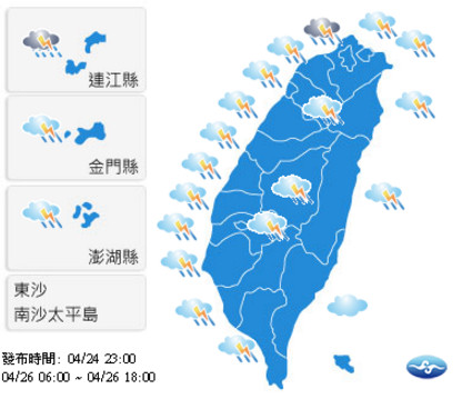 氣象專家吳德榮表示,週三晚至週四氣溫一路下降,週四晚北台灣低溫已降至16、17度。週五至週日(28至30日)天氣轉晴,清晨因夜間輻射冷卻效應,北台灣平地的最低氣溫降至15、16度左右氣。降雨部分,明天(26日)上午前天氣大致穩定,但下午鋒面來襲,各地降雨機率逐漸增加,雨區由北往南擴展,轉為有陣雨或雷雨,中部以北及東北部雨勢明顯,有局部較大雨勢發生機率。