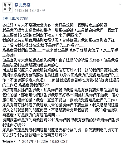該名網友在「靠北奧客」貼文表示,他帶零錢到超商繳費,店員請他協助疊零錢,但他不解為什麼要自己疊,並且認為這應該是店員的工作,雖然原PO心裡有小抱怨,但最後還是幫忙疊好,「後來我也是摸摸鼻子就想說,算了,反正舉手之勞嘛!但是直到今天我越想越感到疑問,也許這樣問會被當成奧客,但是我還是無法壓制住我想要知道答案的心」。