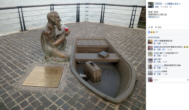 淡水的沿岸徒步區,設有一尊馬偕銅像,只見他手捧聖經跪在地面上禱告,身旁的是他搭乘而來的小船,藉此表達他對上帝堅定的信仰,以及對淡水這片土地的貢獻。不過最近有網友發現,有民眾將垃圾放在這尊銅像上,讓網友忍不住笑說:「對不起……雖然很沒功德心,但我也忍不住笑了!」