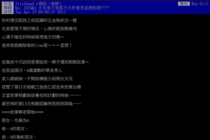 為了找對象,許多人選擇相親,儘管真心赴約,但找結婚對象應先看外表還是內在?一名年約36歲的網友在PTT上發文,朋友介紹一名女子給他,雙方交換了LINE聊天,期間互動還算熱絡,沒想到後來直到約見面吃飯,女方竟說「不帥我真的吃不下飯!」說完就起身說要去廁所,讓男方只能結帳回家。