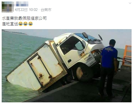 一名網友在網路上貼出照片,他說「水產業我最佩服這家公司」,保證絕對是「產地直送」的新鮮貨,而他們到底是做到什麼地步呢?只見一台貨車的後半部似乎是掉到海裡面了,不過拍照起來又好像是這台車剛從海裡「開上地面」,彷彿是車子開進海裡面捕海鮮似的。