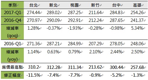 新北市2017年第一季的房價指數為289.02,季微減0.4%,但年度小增0.6%,桃園市最新房價季指數為287.25,季減約1.9%,但年度增加0.79%,至於大台北以外的市場,表現相對穩定,台中今年第一季的房價指數為284.83,季減約1%,但年度小增2.44%,與高檔相比則修正約5.2%,至於高雄市房價指數,此波修正以來距離高點修正幅度在4%以內。