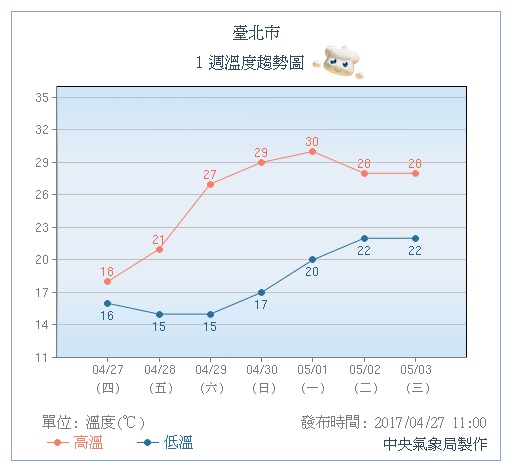 今(27日)受鋒面影響,北台灣濕涼有雨,白天氣溫就一路逐漸下降,今晚就會降至16度左右;其他各地有局部性的陣雨或雷雨,天氣也會轉涼。不過好消息是,明天(28日)起鋒面遠離,天氣轉晴,雖然白天回溫不明顯,高溫僅20度至23度,不過到了週末氣溫就會飆升,各地高溫上看30度。