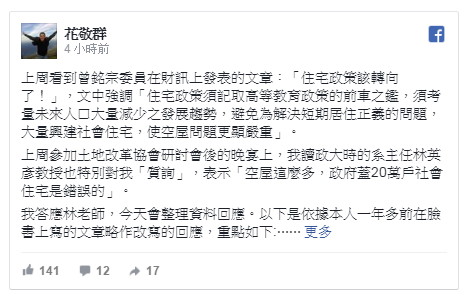 花敬群認為,台灣住宅供給過剩的元兇,其實是「都更」牛步導致,過去每年新完工的住宅,都是以素地興建,而不是透過舊屋都更改建,住宅存量也因此節節高升,累積大量空屋餘屋,若未來新屋供給能從都更改建而來,減少新屋納入買賣市場的比例,如作為社宅使用,才能阻止供給過剩的問題持續惡化。