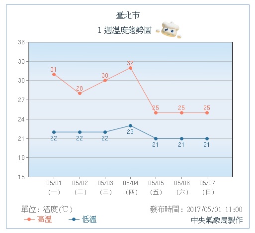 氣象局表示,週一至週四各地為多雲到晴的天氣,中南部高溫可達31至34℃,北部29至30℃,不過中午過後受熱力作用影響,各地山區將有局部陣雨出現,降雨也可能擴及到北部、東北部靠近山區的平地。週二(2日)華南上空有些許水氣移入台灣,中部以北及東半部除了午後易有陣雨外,其他時間也偶有短暫雨發生的機率,請民眾外出務必攜帶雨具。