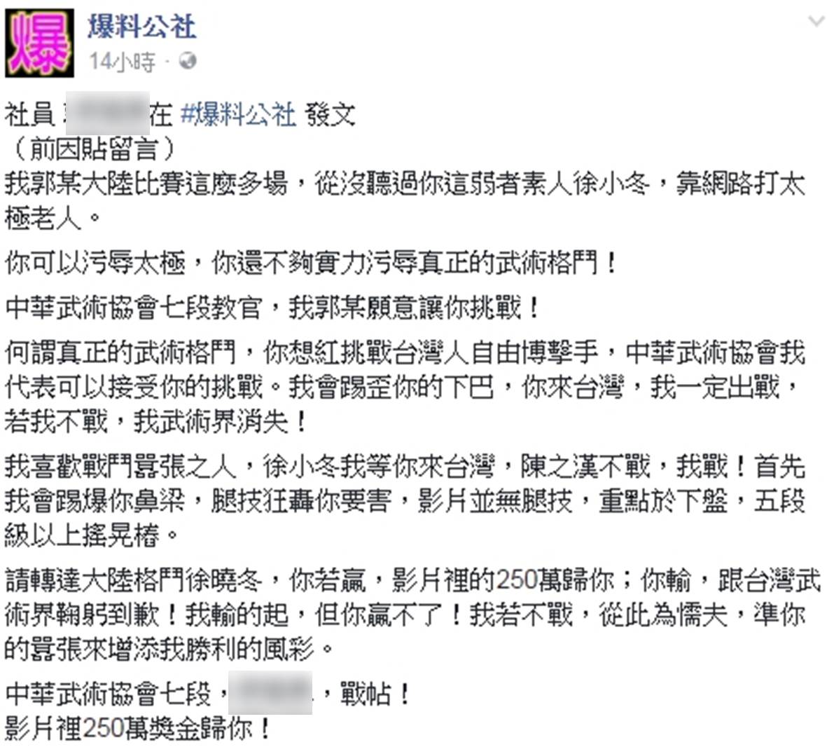 一名自稱中華武術協會7段的郭姓網紅,跳出來說要和徐曉冬來場PK戰,並且在「爆料公社」PO文下戰帖,表示「我郭某大陸比賽這麼多場,從沒聽過你這弱者素人徐小(曉)冬,靠網路打太極老人,你可以污辱太極,你還不夠實力污辱真正的武術,且還PO出好幾疊千元大鈔放在桌上的照片,要網友幫忙轉達徐曉冬,「你若贏,影片裡的250萬歸你;你輸,跟台灣武術界鞠躬到歉!我輸的起,但你贏不了!我若不戰,從此為懦夫,準(准)你的囂張來增添我勝利的風彩(采)。中華武術協會七段,郭OO,戰帖!影片裡250萬獎金歸你!」
