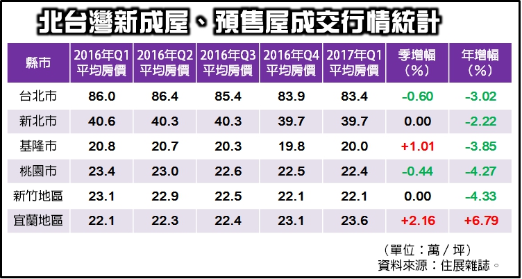 住展雜誌統計北台灣今年Q1新成屋、預售屋房價,結果房價持續走軟的只僅剩台北市與桃園市,新北市與新竹地區暫時止跌、維持平盤,另基隆與宜蘭則微幅上揚。住展雜誌企研室經理何世昌表示,今年來雖然舊建案普遍降價促進成交,但新公開建案價格卻高得驚人,導致整體價格在平盤游移。不過,因市場缺乏追價動能,預估房價還是處在盤整修正的格局不變。