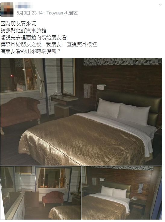 一名網友表示,因為朋友從別的地方要來玩,所以請他先幫忙代訂當地的汽車旅館,原PO訂完之後還很貼心,先進去房間裡面把內裝拍下來讓朋友聞香一下,沒想到照片傳過去之後,朋友卻感覺不太對勁,一直說照片「很怪」,讓拍下照片的原PO百思不得其解,於是將照片貼上《爆廢公社》,想問問網友們有沒有看出端倪。