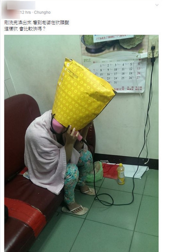 ▼網友對於老婆罩著紙袋吹頭髮,感到匪夷所思(圖/爆廢公社)