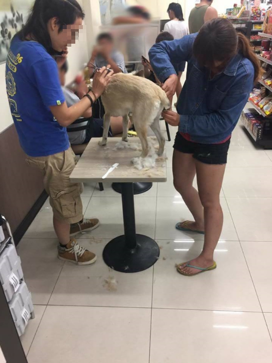有網友在《爆料公社》PO文說「原來7-11可以……」,難道是又推出新的服務了嗎?只見照片中,一男一女在超商的休息座位區占了一個桌子,不過他們並不是超商店員,沒有在休息、吃東西,而是把一隻狗放在桌子上,兩人在幫牠做「寵物美容」!