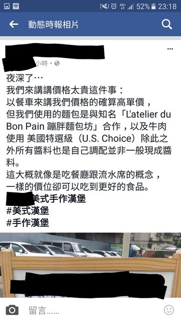 店家曾在臉書po文解釋,「以餐車來講我們的確是高單價,但我們使用的麵包是蹦胖麵包坊、美國特選級牛肉,醬料也非現成醬料,這是吃餐廳跟流水席的概念,一樣的價位卻可以吃到更好的食品」。