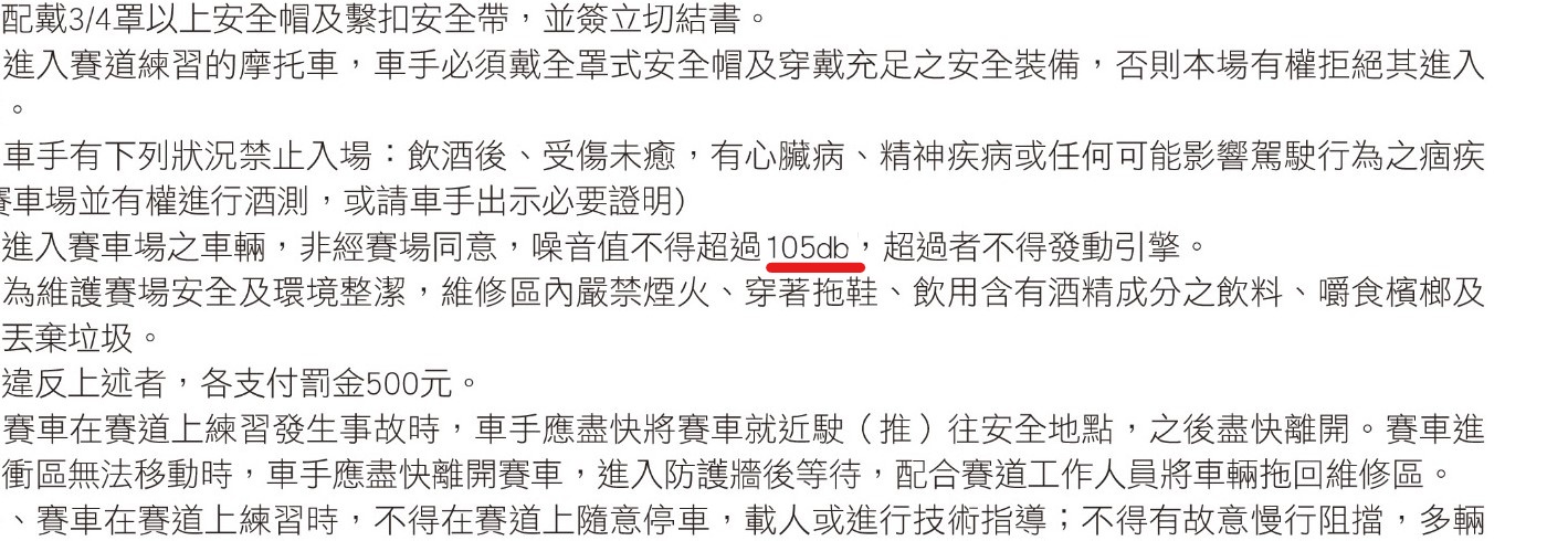 雖說大鵬灣賽車場即日起開始嚴格執行噪音檢驗,但過去賽場本就有針對賽事用車或練習車輛進行噪音檢測的流程,若是超過105分貝則不得發動引擎,情節嚴重者還會不列入比賽成績,往後取消會員練車一個月內免噪音檢測的規定,且要簽立切結書才能領取計時器。