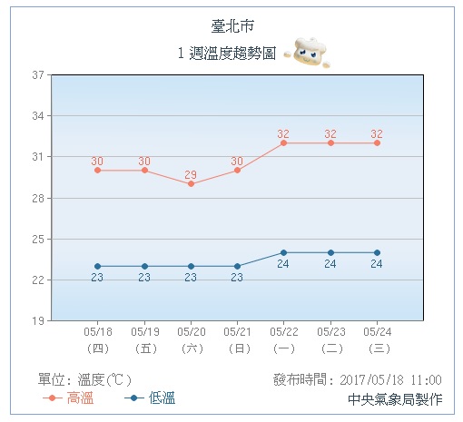 氣象專家吳德榮表示,今(18)日鋒面滯留在巴士海峽,西半部為多雲時晴的天氣,高溫逹32度,東半部及午後山區有局部短暫陣雨的機率。不過下一波較強的鋒面,會在下週三(24日)接近台灣,屆時天氣轉趨不穩定,午後有雷陣雨。下週四、五(25、26日)鋒面通過,各地有陣雨、雷雨,氣溫下降。