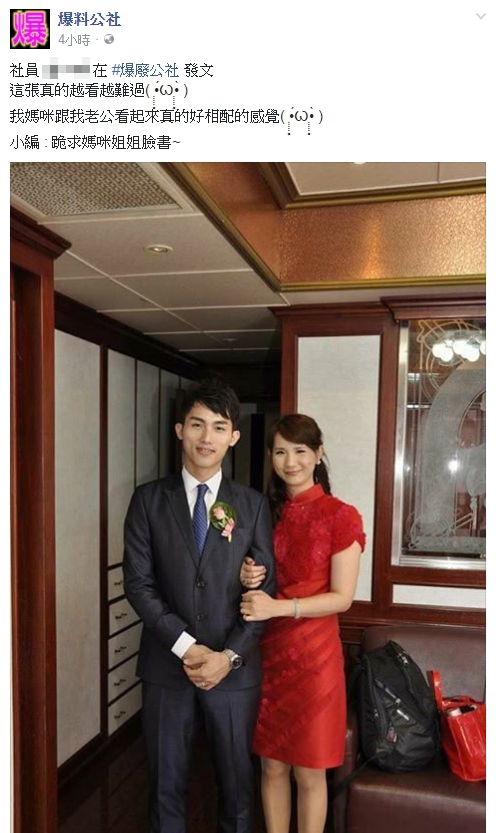 該名女網友在臉書「爆廢公社」貼出一張照片,劈頭就說自己很難過,只見此張照片應該是家裡辦喜事時的照片,男生穿著西裝,胸前別著胸花,是個新郎倌的打扮。而右邊穿著紅色旗袍的女子,將過肩的長髮,俐落地綁起公主頭,親暱地挽著新郎,看上去實在「登對的佳偶」。