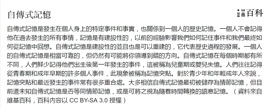 自傳式記憶自傳式記憶是發生在個人身上的特定事件和事實,也關係到一個人的歷史記憶。一個人不會記得他在過去發生的所有事情,記憶是有建設性的,以前的經驗影響我們如何記住事件和我們最終如何從記憶中回想。自傳式記憶是建設性的並且也是可以重建的,它代表歷史過程的發展。一個人的自傳式記憶是相當可靠的,但仍然有可能將你領導到錯的方向。自傳式記憶在每個時期都有所不同,人們鮮少記得他們出生後第一年發生的事件,這被稱為兒童期或嬰兒失憶。人們往往記得從青春期和成年早期的許多個人事件,此現象被稱為記憶突點。對於青少年和年輕成年人來說,記憶突點和最近發生的事件常有很多重合處。大多相信自傳式記憶最初被儲存為情節記憶,但目前還未知自傳式記憶是否等同情節記憶,或是可將之視為隨着時間轉換的語意記憶。(資料來自維基百科,百科內容以 CC BY-SA 3.0 授權)值得指出的是,超憶症者也會跟正常人一樣有「虛假記憶」,甚至可能有更高的記憶出錯率。加州大學爾灣分校團隊於2013年發表的另一篇研究論文,測試對比了超憶症實驗組和正常人對照組的記憶出錯率。