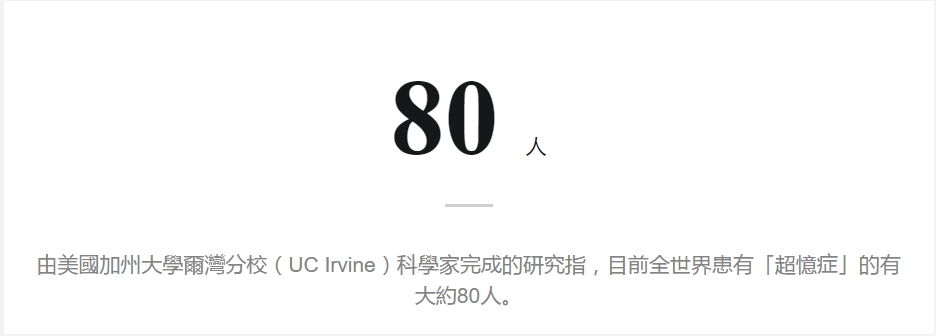根據加州大學爾灣分校團隊10年來的研究,這種極為罕見的醫學現象在全球範圍內大約只在數十人身上出現。它屬於「無選擇記憶」的一種,臨床表現為大腦擁有自動記憶系統。有超憶症的人,會利用通常用來處理語言的大腦左額葉(left frontal lobe)和通常用來儲存圖像記憶的後頭區(occiput)來儲存長期記憶。