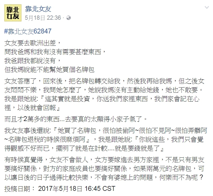 一問之下才發現,原來是因為原PO媽媽收到名牌包之後,並沒有主動拿錢給女友,而女友又不敢開口要。原以為原PO身為男友能做為橋樑,提醒媽媽要付錢,沒想到原PO竟然和女友說「這其實就是投資,你送我們家裡東西,我們家會記在心裡,以後就會回報」,還說「才2萬多的東西」,如果真的去要就太顯得小家子氣了。