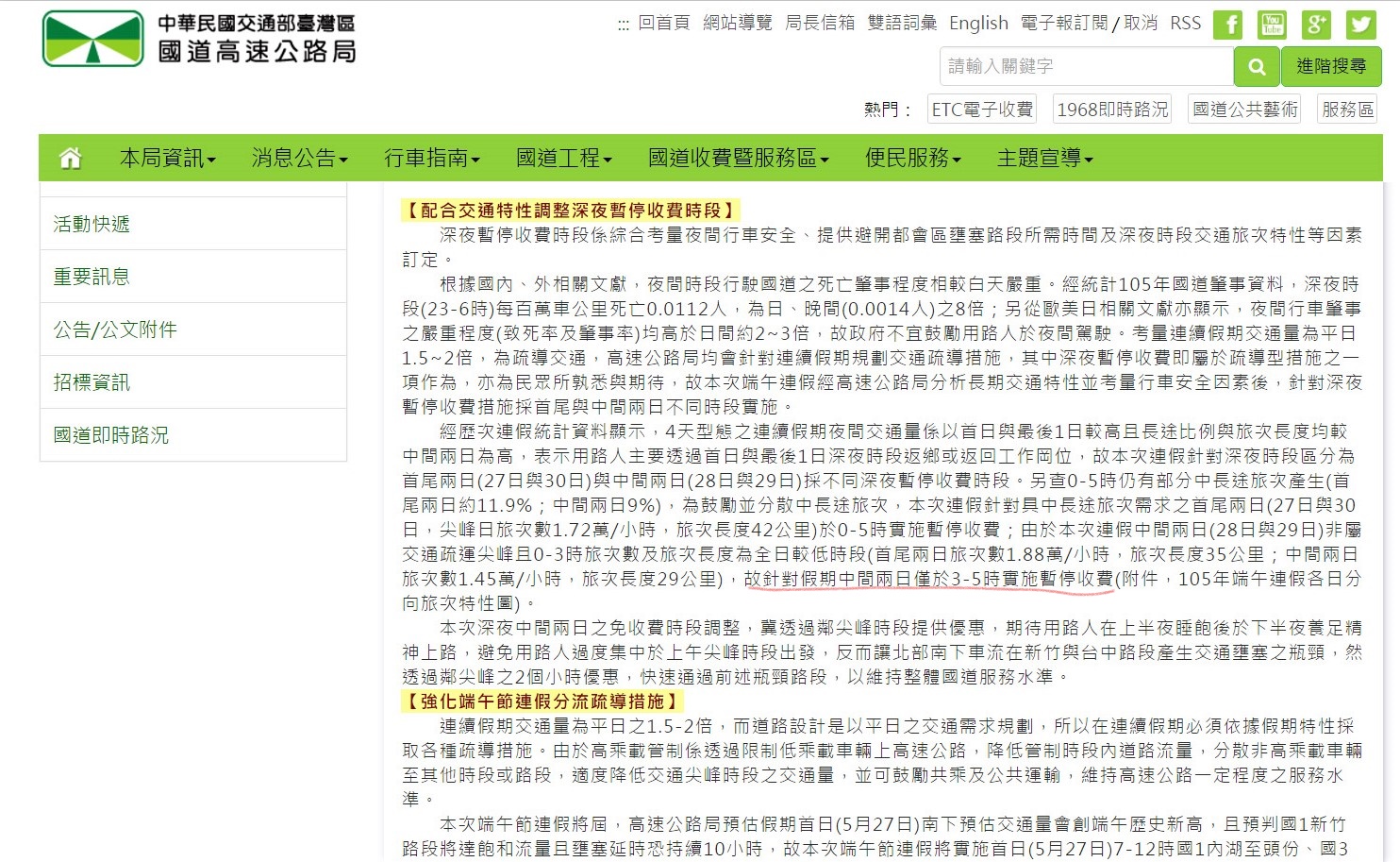▼(圖/今日發出的聲明消息中,因應民意將夜間免收費時段統一為0至5時/翻攝自高公局網站)