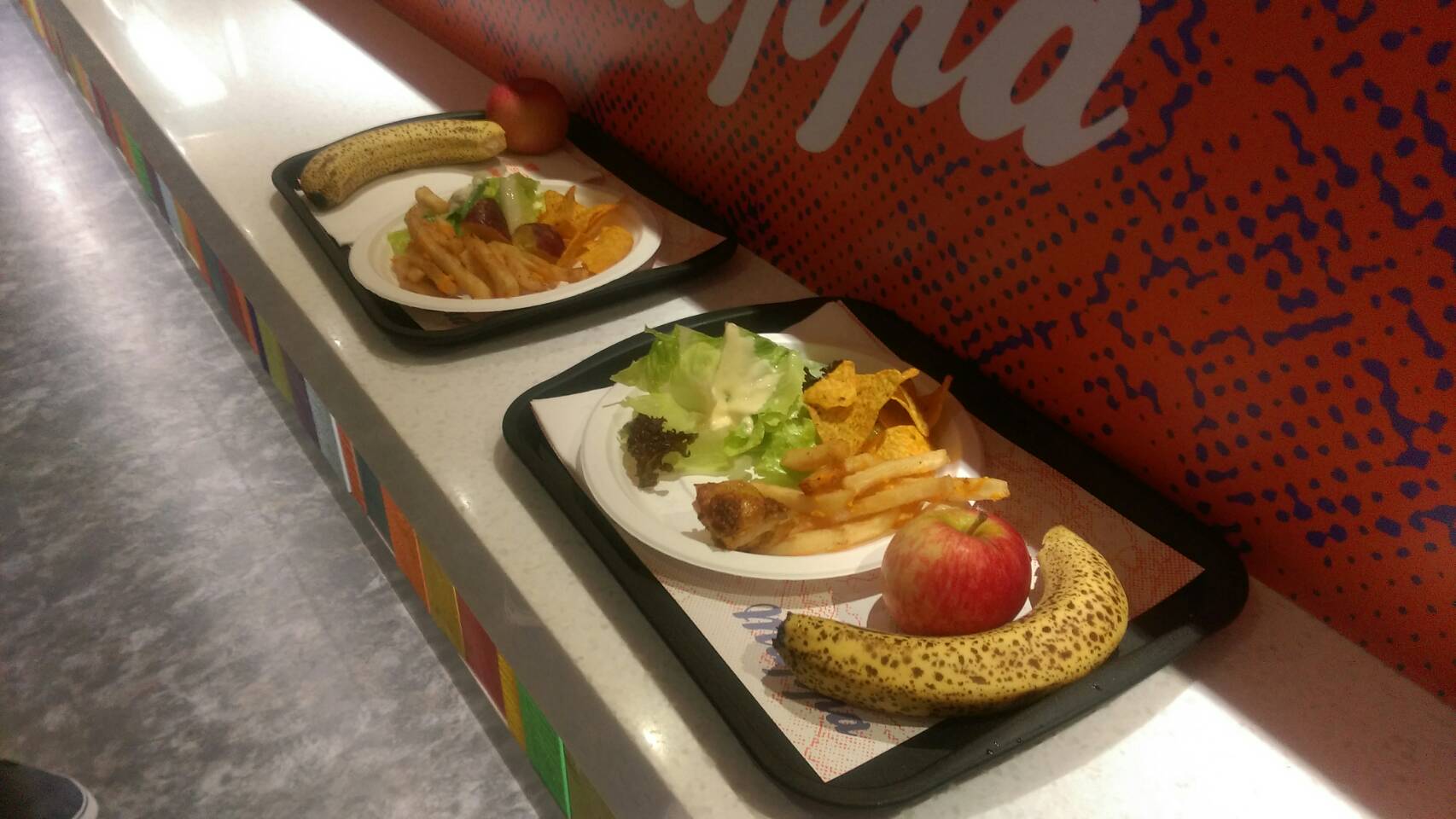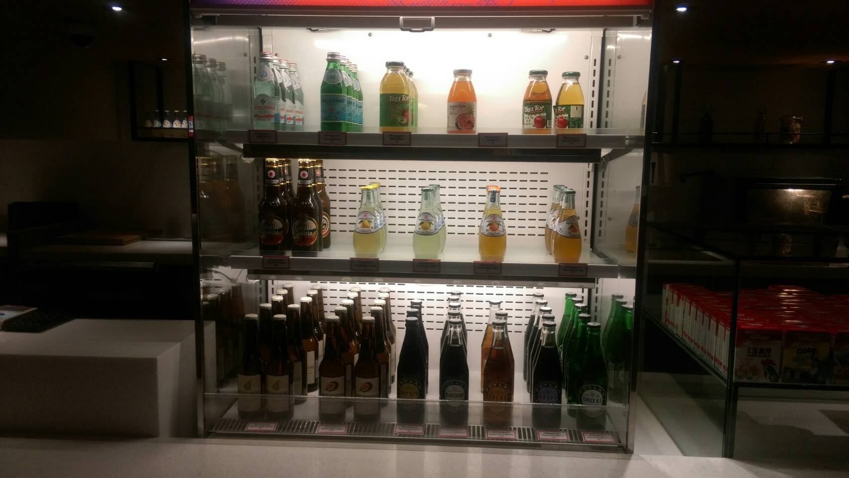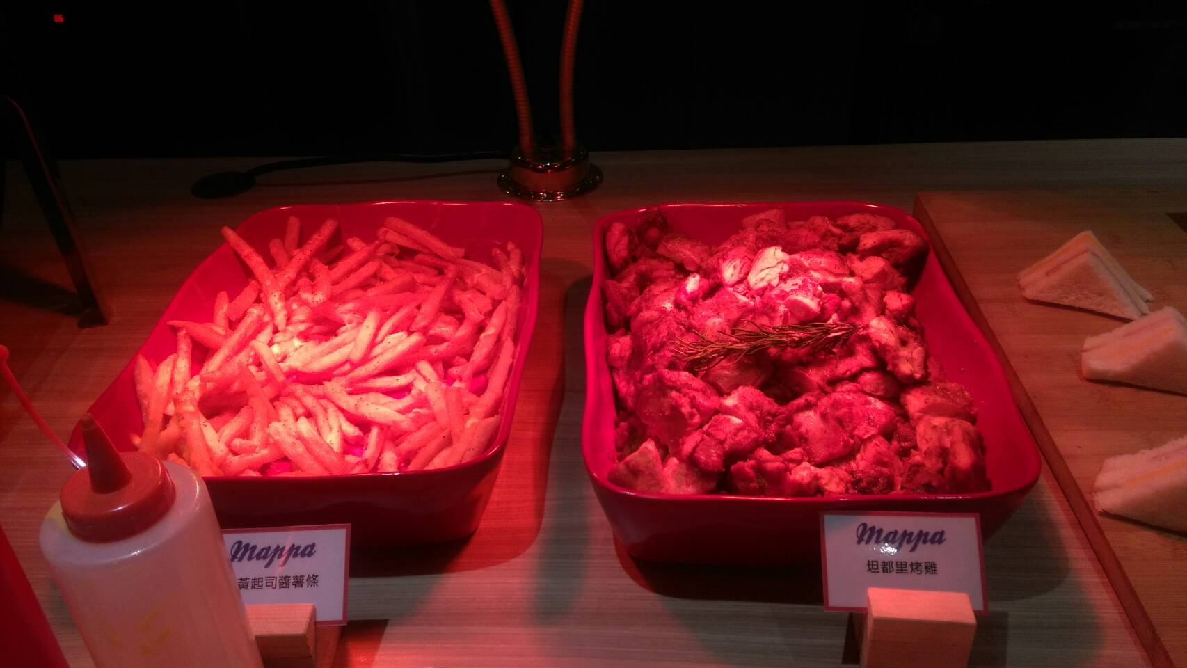 餐點部分,有分早中午三餐,每天都會根據季節性食物進行菜色調整,品項大約有20多項,除了一定有的爆米花、汽水、咖啡外,還有像是沙拉、烤雞、鬆餅、各類蛋糕,甚至還有丼飯、義大利麵、關東煮及烏龍麵等。