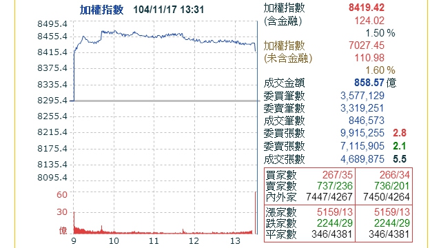 證所稅糾纏三年,正式三讀拍板廢除!立法院今天(17日)表決處理證所稅存廢,在國民黨多數優勢下,證所稅歸零,僅剩千分之三的證交稅,台股開盤一路開高走高,終場大漲124點收8419點。
