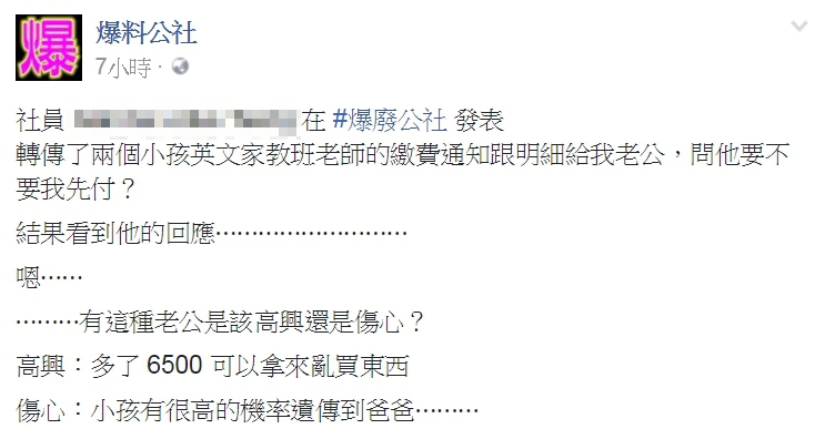 一名女網友在《爆廢公社》表示,日前將兩個小孩上英文家教班的繳費通知跟明細轉傳給老公,從Line對話的截圖上,可以看到原PO列出的明細指出,其中一個孩子的月費是3000元,另一個則是3500元,兩人加起來總共是6500元。老公看了之後表示他要付錢,並且再向原PO確認「所以是13000元嗎?」,這讓她看了匪夷所思,於是反問「13000是怎麼算出來的」。