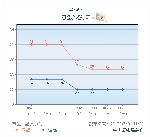 氣象專家吳德榮表示,明(31日)滯留鋒持續北移,各地有局部陣雨或雷雨的機率,白天若未遇降雨的地區,空氣暖濕、感覺比較悶熱。週五、六(2、3日)滯留鋒再度緩慢往南移動,伴隨強勁西南氣流在台灣上空,是影響最劇的一段時間,要注意強對流所伴隨之強風、雷擊、瞬間大雨等劇烈天氣。