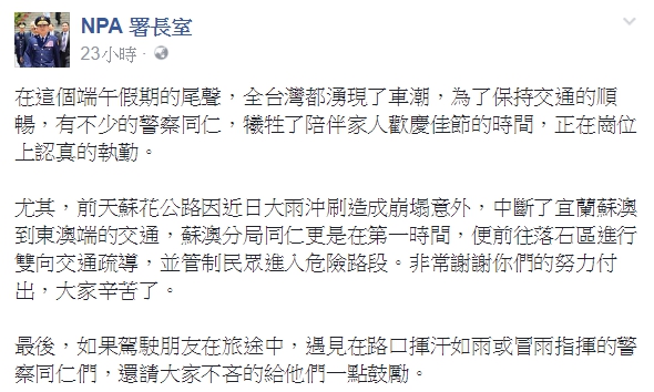 落石坍方,阻礙交通,讓許多往返民眾傷透腦筋,更影響了放假的心情,抱怨連連。而NPA署長室昨(30日)在臉書發文表示,仍有警察為指揮交通而犧牲與家人過節的時間,提醒大家「不吝惜的給他們鼓勵」。