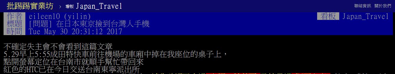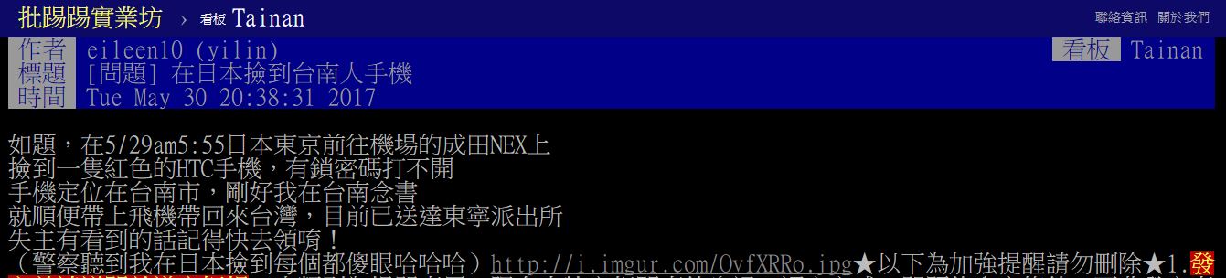 不過這時原PO發現,這隻手機的螢幕顯示「中文」內容,而且定位點顯示在台南市!原來是手機的失主也是台灣人,而原PO自己剛好也在台南市讀書,所以就把手機帶回台灣,交給臺南東寧派出所,並且於事後將這件事PO上《PTT》的台南板跟日旅板,希望失主可以看到。