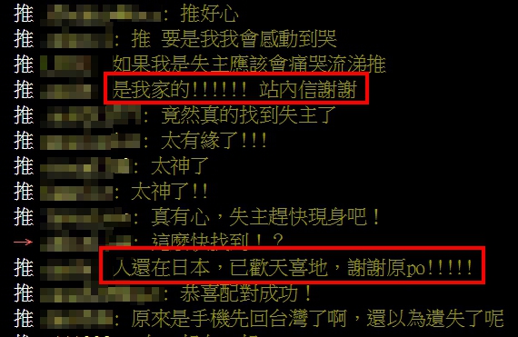 沒想到文章PO出不到一個小時,手機失主就現身留言,並感激地表示「是我家的!人還在日本,已歡天喜地,謝謝原po!!」