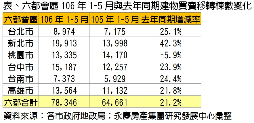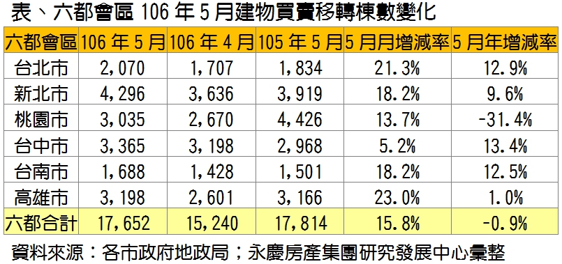 今(1)日六都會區公布5月份建物買賣移轉棟數,交易量最大為新北市4,296戶,最少則是台南市1,688戶,六都合計17,652戶,較4月增加15.8%,與去年同期比較則微幅減少0.9%。