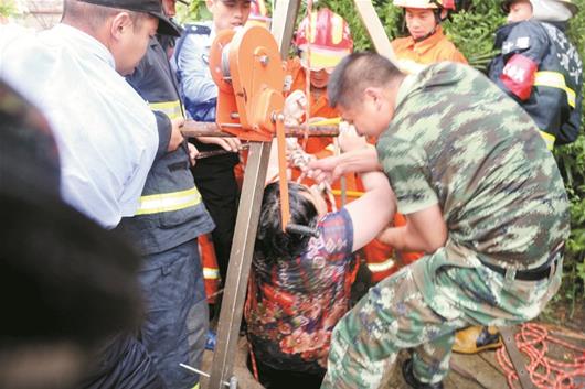 4日凌晨,大陸湖北有名女子掉入井中,因為身材豐腴,難以救出,6名搜救人員又拉又「頂」,才把她救出井中。