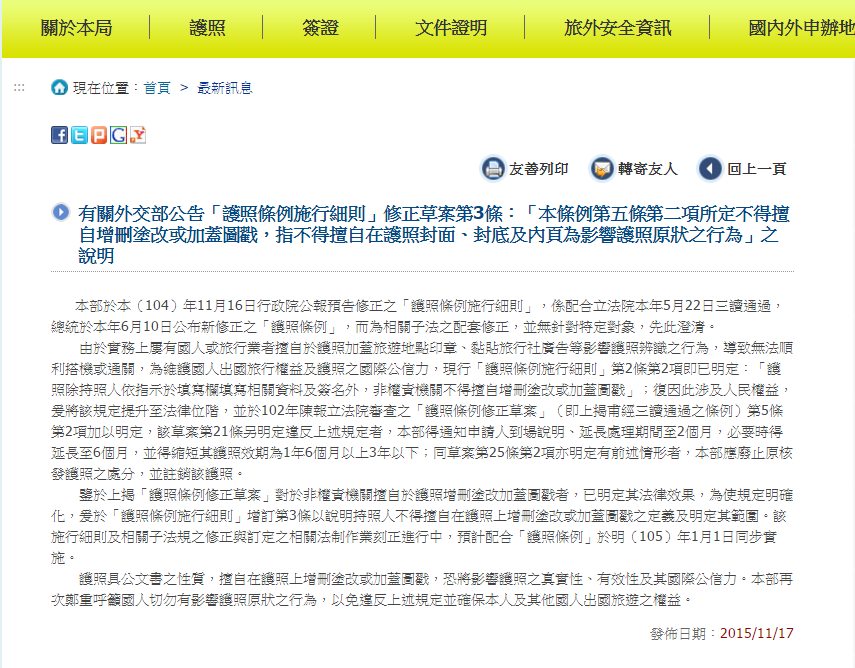 11/16號晚上,外交部修正了細則,仔細看看第三項,不得在護照上增刪塗改或加圖章,擺明就是不給貼貼紙。因此部分網友寫歌諷刺政府只關心小事,但事實上如果任意變換護照外觀,外交部的確有權力可以註銷護照,甚至今年就有人因為貼貼紙,在洛杉磯被海關關切。