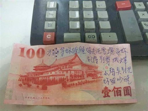 司改國是會議日前決議將通姦除罪化,引發部分人士擔憂違反家庭價值。一名網友近日在臉書「爆廢公社」上PO出照片,表示他從一張百元紙鈔就發現一段「不尋常的姦情」,只見上頭用藍色原子筆:「等你睡,姐夫在客廳等你」、「記得別穿內褲」等鹹溼字眼,讓網友看後直呼「姦情曝光了」!
