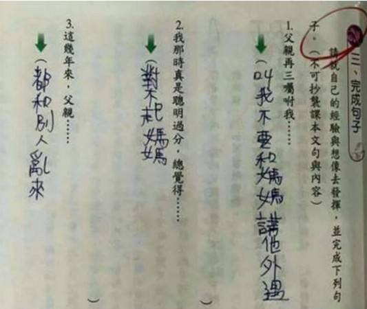 背影」一文,這名學生第1題為「父親再三囑咐我…」,他回答「叫我不要和媽媽講他外遇」;第2題為「我那時真是聰明過分,總覺得…」,他竟寫「對不起媽媽」;第3題「這幾年來,父親…」,他