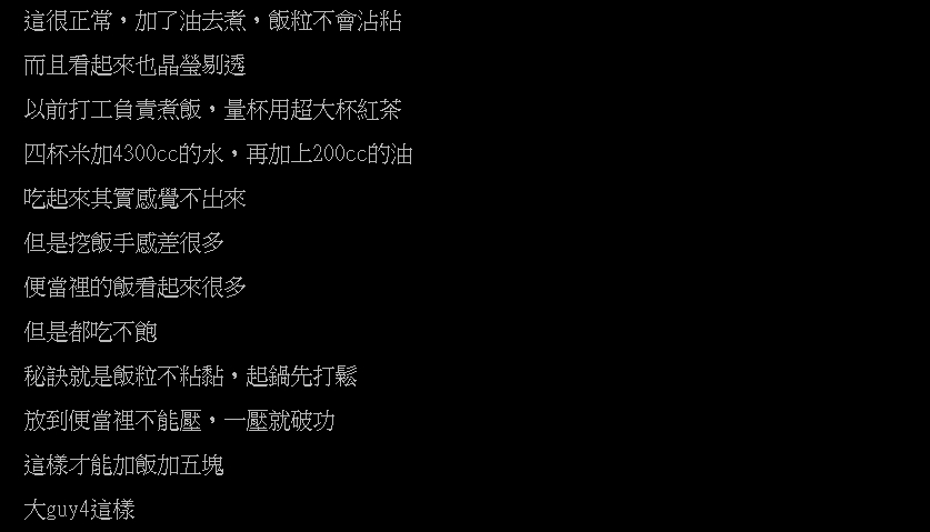 不過,這篇文章也成功釣出了便當店前店員,他表示「這很正常,加了油去煮,飯粒不會沾黏,看起來也晶瑩剔透」。他還指出,過去打工時「負責煮飯,量杯用超大杯紅茶,4杯米加4300cc的水,另外再加上200cc的油」,雖然吃不出來,但是挖飯時就會知道手感不同。