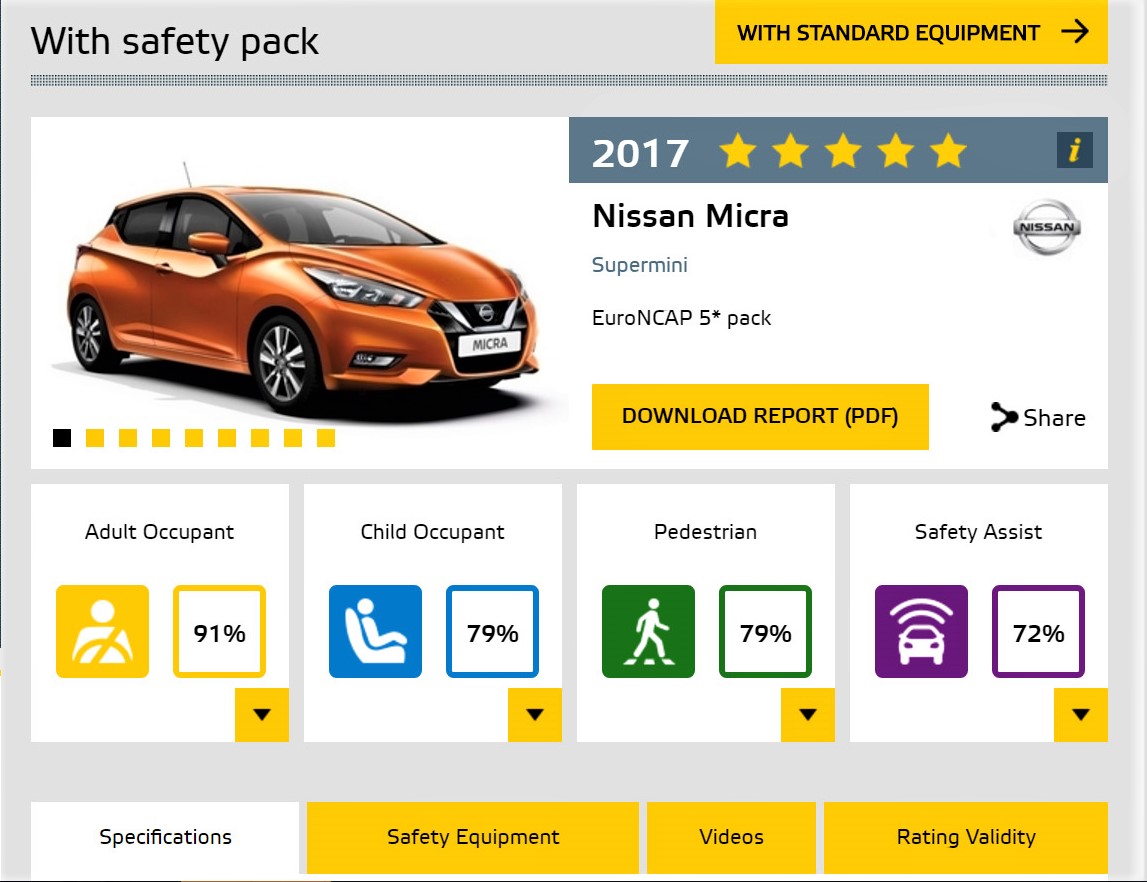 過去小型車的安全性常給人不夠完整的印象,為了扭轉這樣的情況,車廠在新車開發時也會應用一些高剛性鋼材或其它安全設計,但小型車因為成本考量,有時候不見得能導入太多昂貴的車體材料,不過受惠於新世代的電子輔助安全科技,五代Nissan Micra得以拿下Euro-NCAP的五顆星評價(With Safety Pack)。