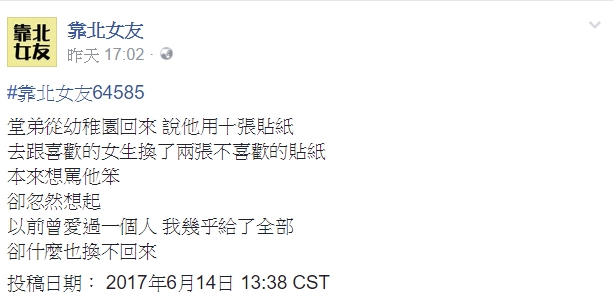 網友在臉書社團《靠北女友》分享了一個小故事,「堂弟從幼稚園回來,說他用十張貼紙,去跟喜歡的女生換了兩張不喜歡的貼紙。本來想罵他笨, 卻忽然想起,以前曾愛過一個人,我幾乎給了全部,卻什麼也換不回來。」