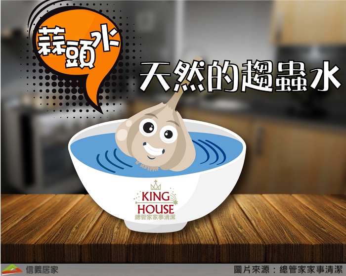 將蒜頭泡水後即成了天然驅蟲水,噴在屋子的角落及小蟲常出沒的位置,蟲蟲們就會因氣味而離開。