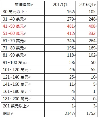 根據台北市地政局的地政加值服務統計顯示,今年第一季台北市住宅平均單價成交最多的區間,是落在每坪41~50萬元,佔了北市整體住宅的22.5%,等於北市今年第一季的房市交易中,每5戶就有一戶成交41~50萬元,其次則是每坪51~60萬元,單價每坪41~60萬元就佔了成交的4成,若以今年第一季與去年同期的件數來看,則可發現今年第一季北市交易量回溫年增逾2成。