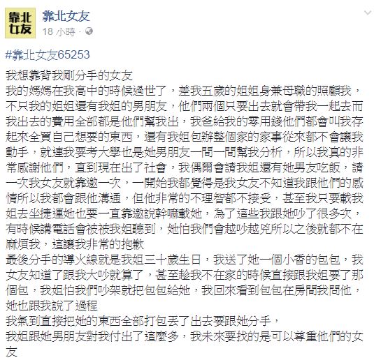 靠北女友》PO文,自己的女友經常嫌棄他對姊姊太好,甚至直接去找姊姊要回他送的孝心禮物,氣得他決定放生對方。