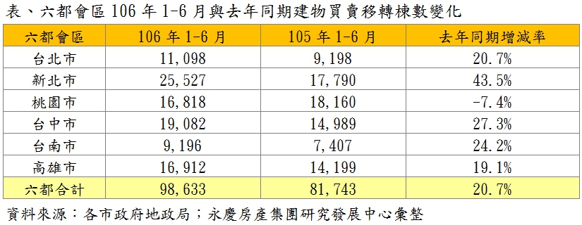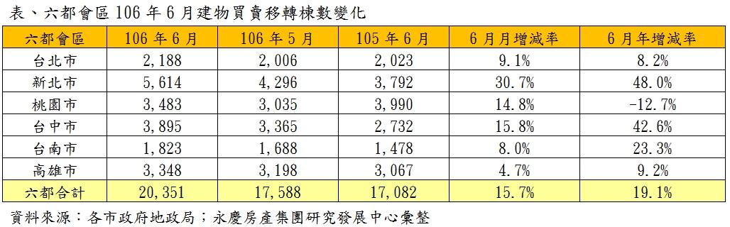 六都會區公布6月份建物買賣移轉棟數,交易量最大為新北市5,614戶,最少則是台南市1,823戶,六都合計20,351戶,較5月增加15.7%,與去年同期比較增加19.1%。