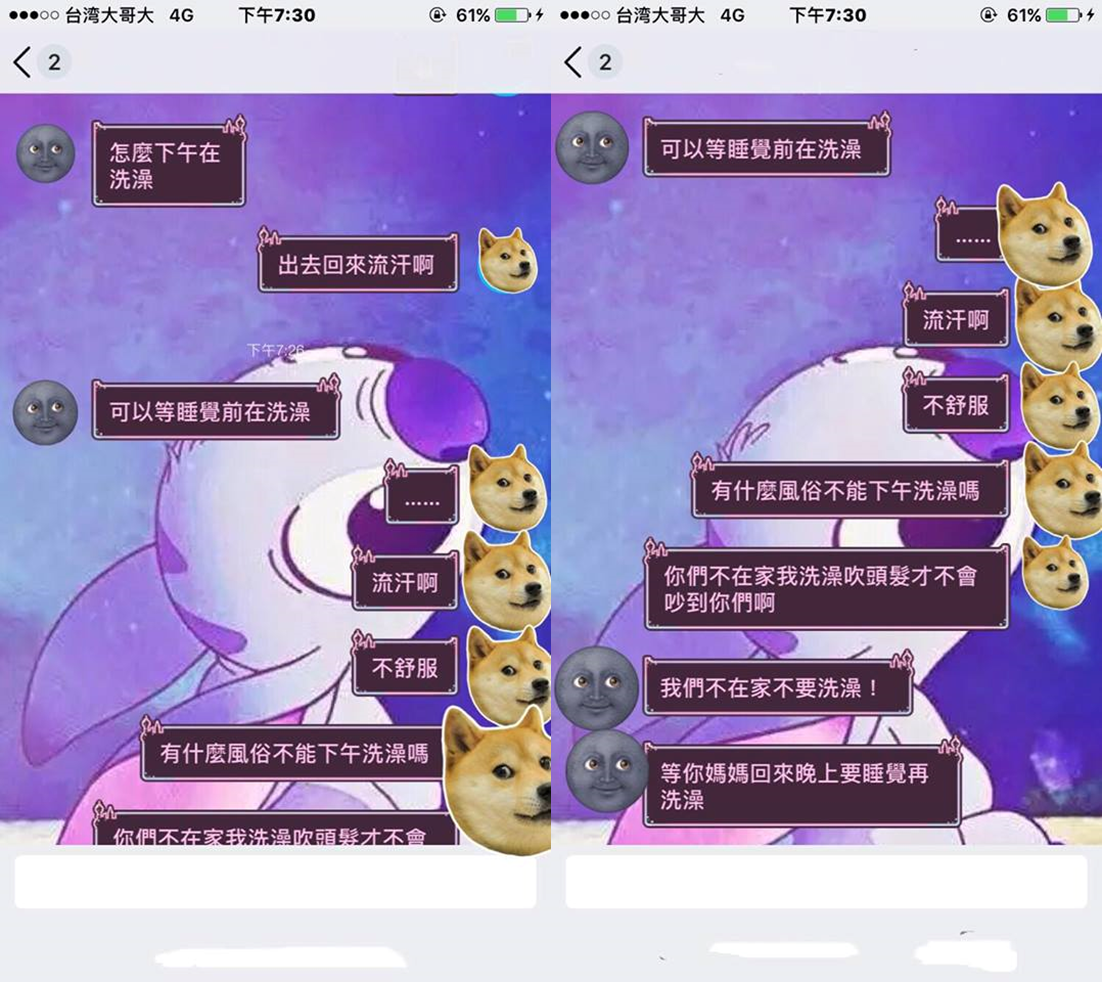 根據網友在臉書社團《爆怨公社》的發文,她有天出門回家後,因為流汗不舒服就先跑去洗澡,想不到梳洗完畢後看到繼父傳LINE訊息過來,問「怎麼下午在洗澡?可以等睡覺前再洗澡」,原PO就回應「流汗啊,不舒服,有什麼風俗不能下午洗澡嗎?你們在家我洗澡吹頭髮才不會吵到你們啊」,可是繼父卻說「我們不在家不要洗澡!等妳媽媽回來晚上要睡覺再洗澡。」