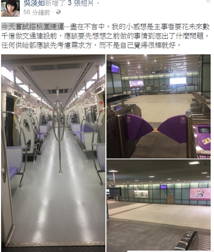 作家吳淡如今天中午在臉書PO出她搭乘機捷的3張照片,只見整個機捷車廂、入口閘門、通道等,都空無一人。吳淡如寫道:「今天嘗試搭桃園捷運⋯盡在不言中」,並談到最近吵的前瞻計畫議題,還向政府喊話,「我的小感想是主事者要花未來數千億做交通建設前,應該要先想想之前做的事情到底出了什麼問題。任何供給都應該先考慮需求方,而不是自己覺得很棒就好」。