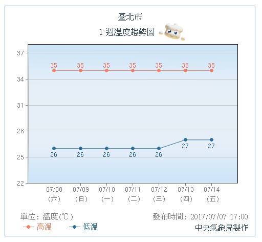 除此之外,週日至下週四(9日至13日)低層水氣逐漸減少,大氣不穩定的程度比較降低,上半天晴朗,午後仍有對流發展的機率,大部分在山區消長,但影響範圍及強度皆會明顯減小。氣溫部分,未來一週西半部白天高溫大約也都在33至35度,東半部則在32至34度,整體感覺還是熱。