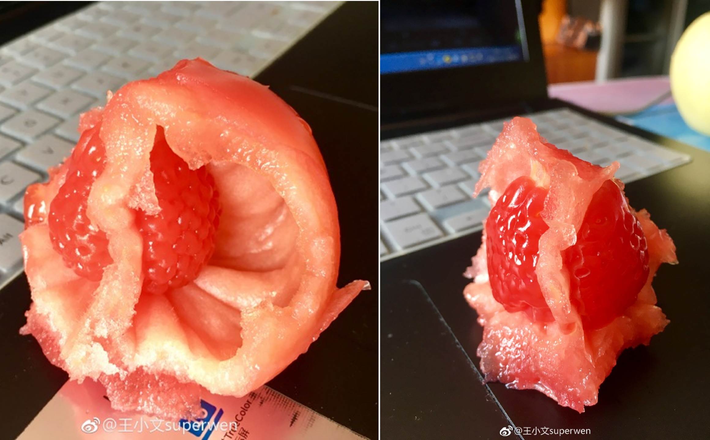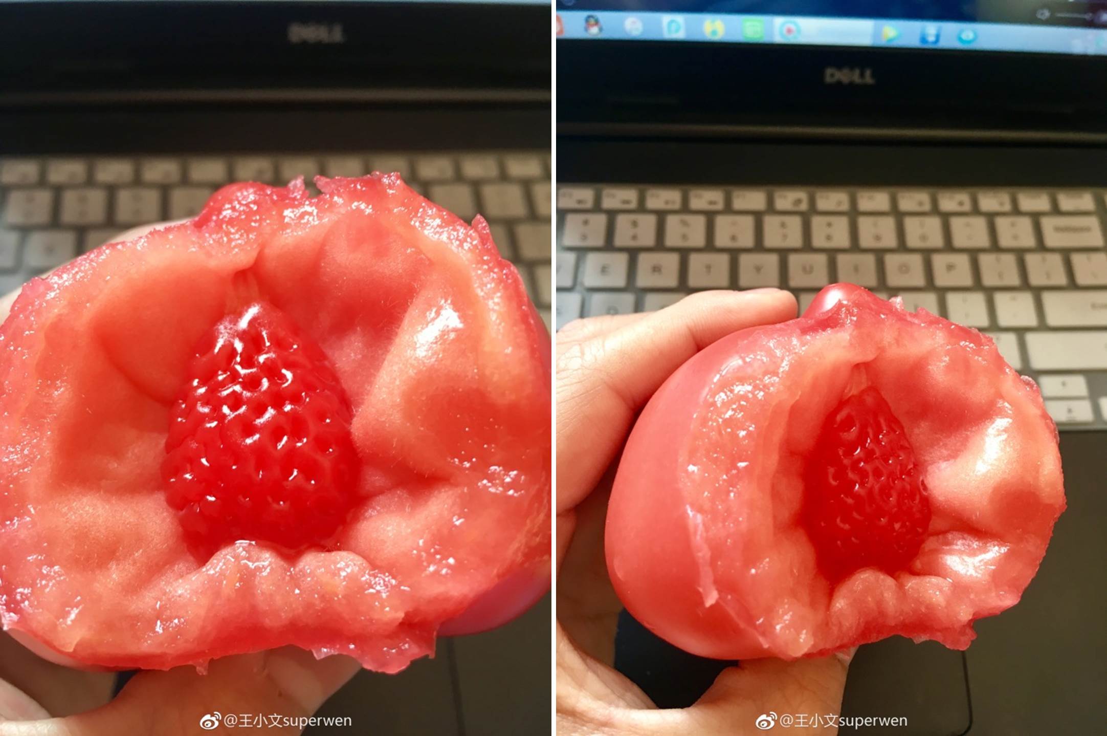 大陸一名網友在微博PO出一張照片,驚訝地表示「我今天中午吃一個西紅柿(番茄)」,沒想到咬了一口,就看到裡面藏了一個像是草莓的東西,讓原PO覺得有點傻眼,照片PO出後,立刻登上微博熱搜排行榜的第二名。