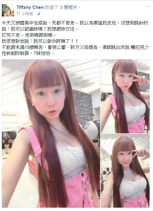 在網路上擁有超高人氣的女模「Tiffany Chen」(T妹),因童顏且擁有傲人身材,深受網友歡迎,已有不少粉絲的她,日前在臉書透露自己被國高中生搭訕,當時還以為自己是要被搶皮包,沒想到對方一靠過去就跟她說「想交往」,讓都可以做高中生阿姨的她感到哭笑不得!