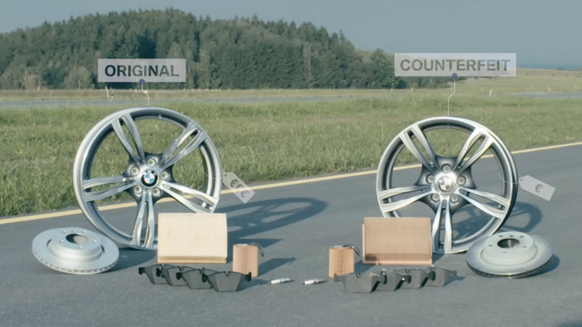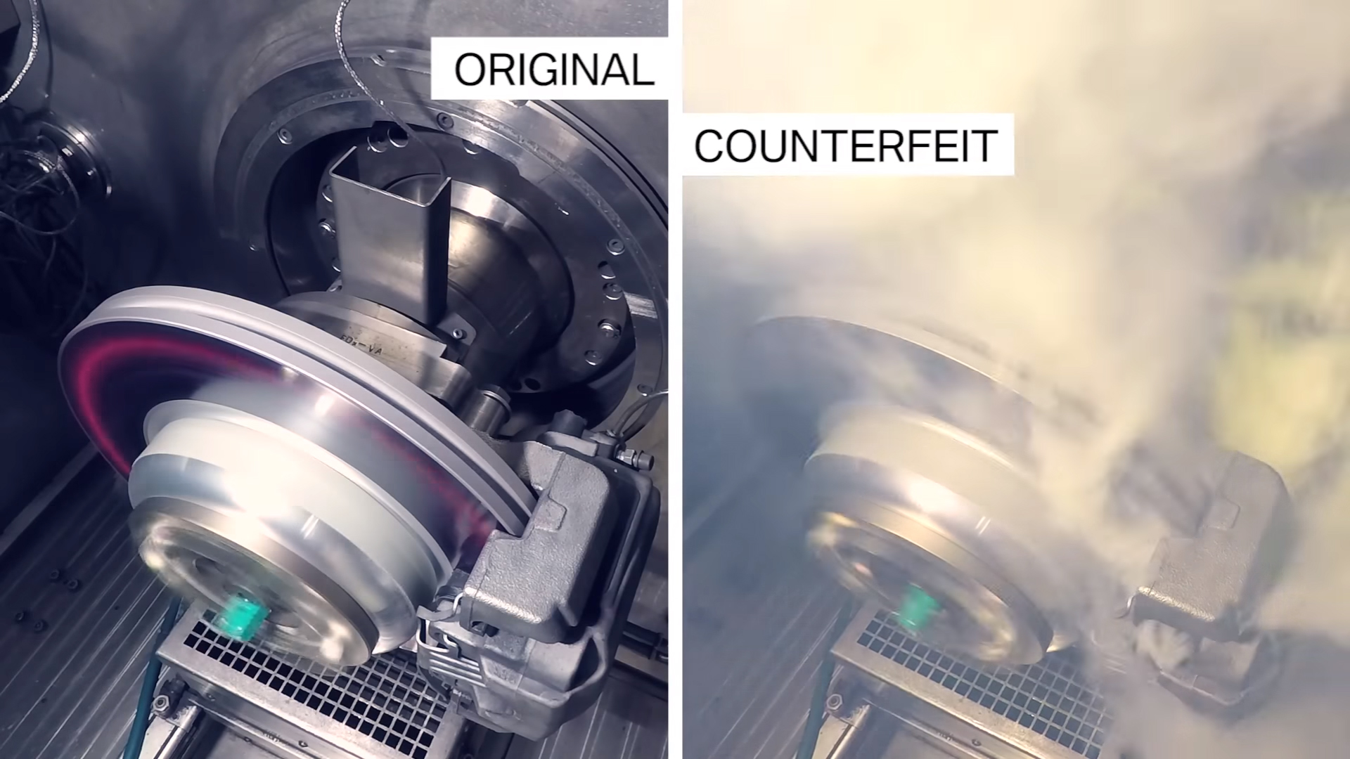 從該段實驗影片當中,BMW技師找來了仿冒的煞車來令片,與正廠部品一同進行摩擦試驗,發現幾次急煞之後,仿冒品來令片已經開始冒出大量白煙、最後甚至直接碳化崩解,數據上還能看出,隨著溫度上升,原廠零件並沒有明顯的衰竭,但仿冒品的摩擦係數卻降低了30%左右,耐用性堪慮。