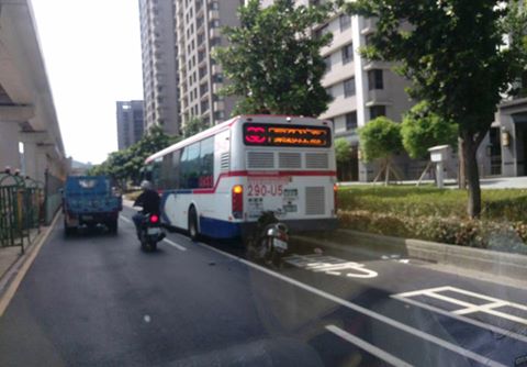 有網友在臉書不公開社團「爆廢公社」貼出照片,一名藍衣男子騎著機車,左手控制著機車龍頭,右手滑著手機,低著頭相當認真,想不到下一秒他就一頭撞上前方的公車,用力吻上公車屁股,衣服整個飛起,安全帽還脫落,相當驚險,而這生動的一瞬間被截圖放上網路,引起網友熱烈討論。