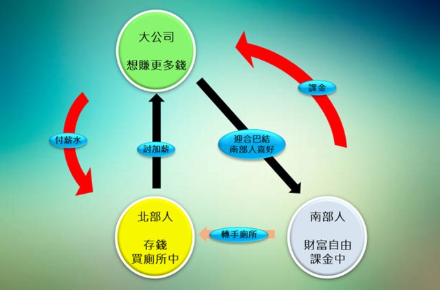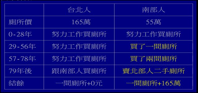 有位神人級網友看到後,就以「廁所」進行南北經濟分析,以目前法定最低薪資2萬1009元來看,台北房價一坪平均55萬,高雄房價一坪平均20萬,假設一個廁所用三坪計算,可以發現南部人整體過得比北部人還要幸福很多,因為「南部人只要不吃不喝28年後就可以實現個人小便自由,能夠隨時隨地上廁所,甚至在未來,把二手廁所高價轉手給將近80年不吃不喝的北部人。」