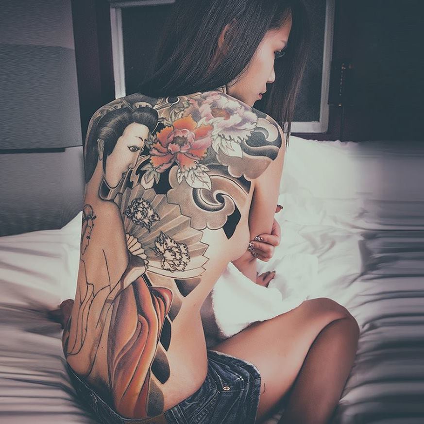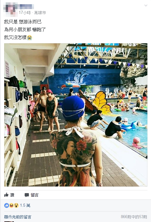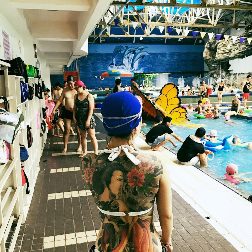 爆廢公社》分享了自己的泳裝美照,眼看她性感的S曲線和美背展露無遺,但是她卻大嘆了一口氣,講說「我只是想游泳而已,為何小朋友都嚇跑了,我又沒怎樣……」原來,因為她的背上刺了一個美麗的「藝妓刺青」,由於圖案佔滿了整個背部,才讓小朋友看到都不敢靠近,就連大人都紛紛投以異樣的眼光。